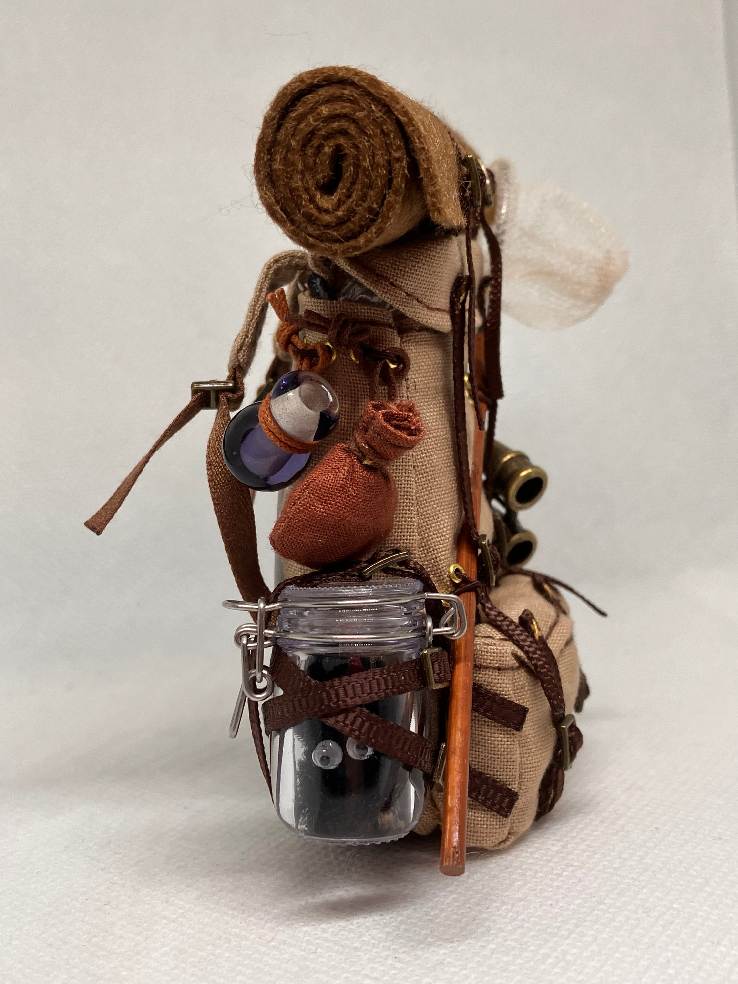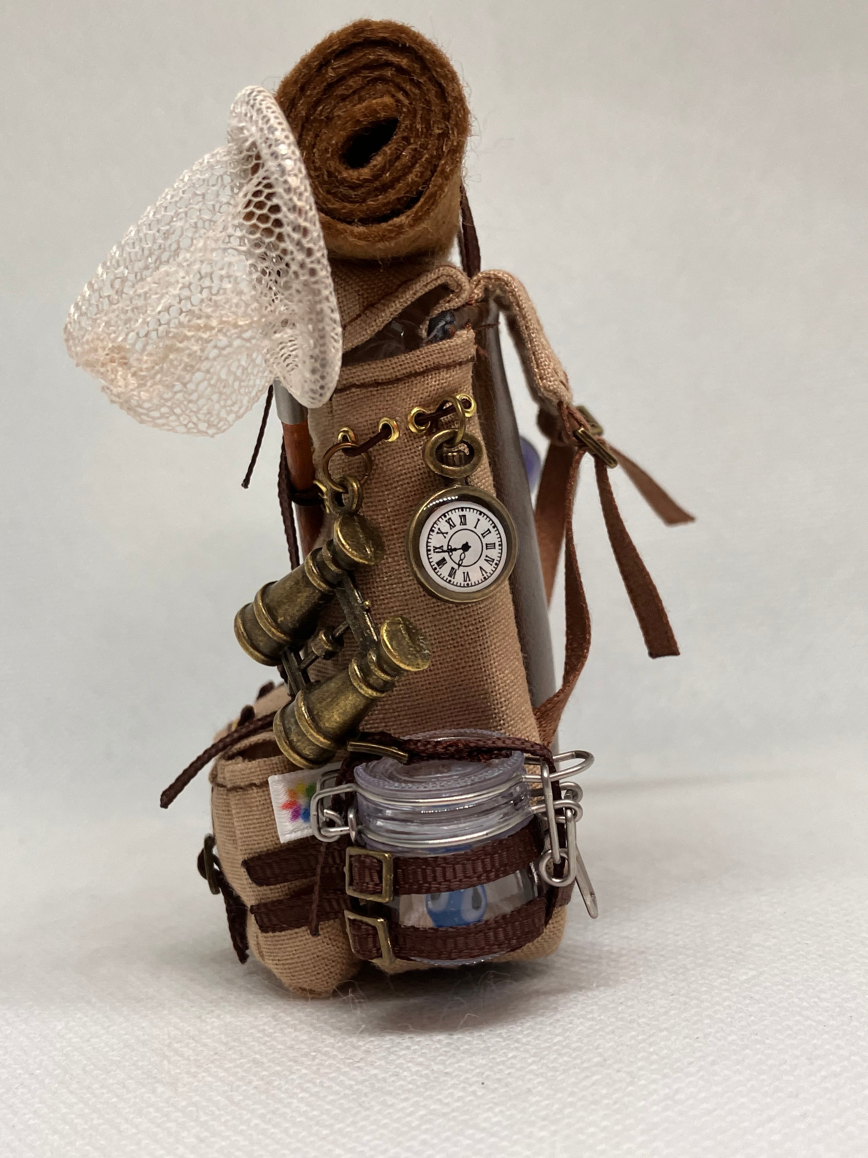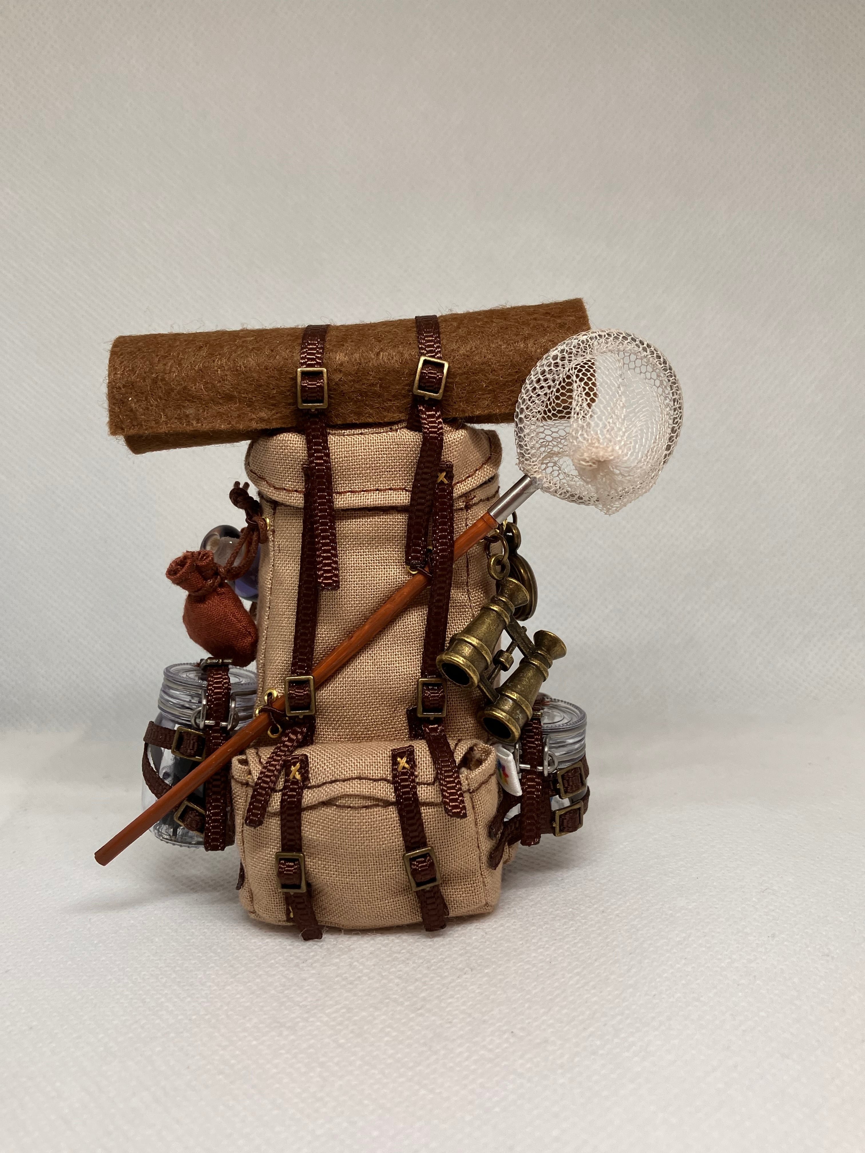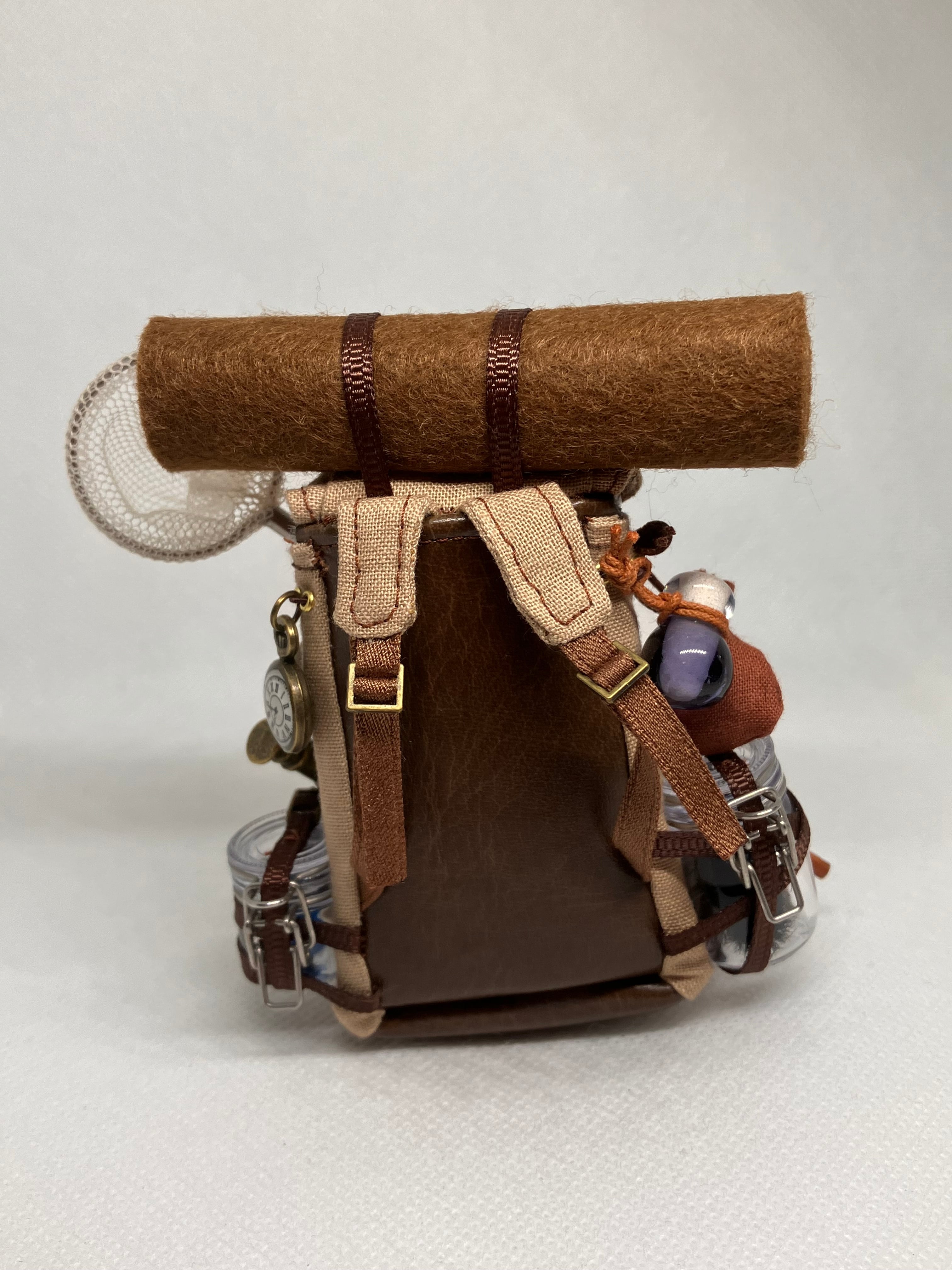 生物学者のリュックは、対象を捕獲する網に加え、両側の飼育容器に黒い毛のモンスターとスライム(ガラスで制作しています)が入っています。